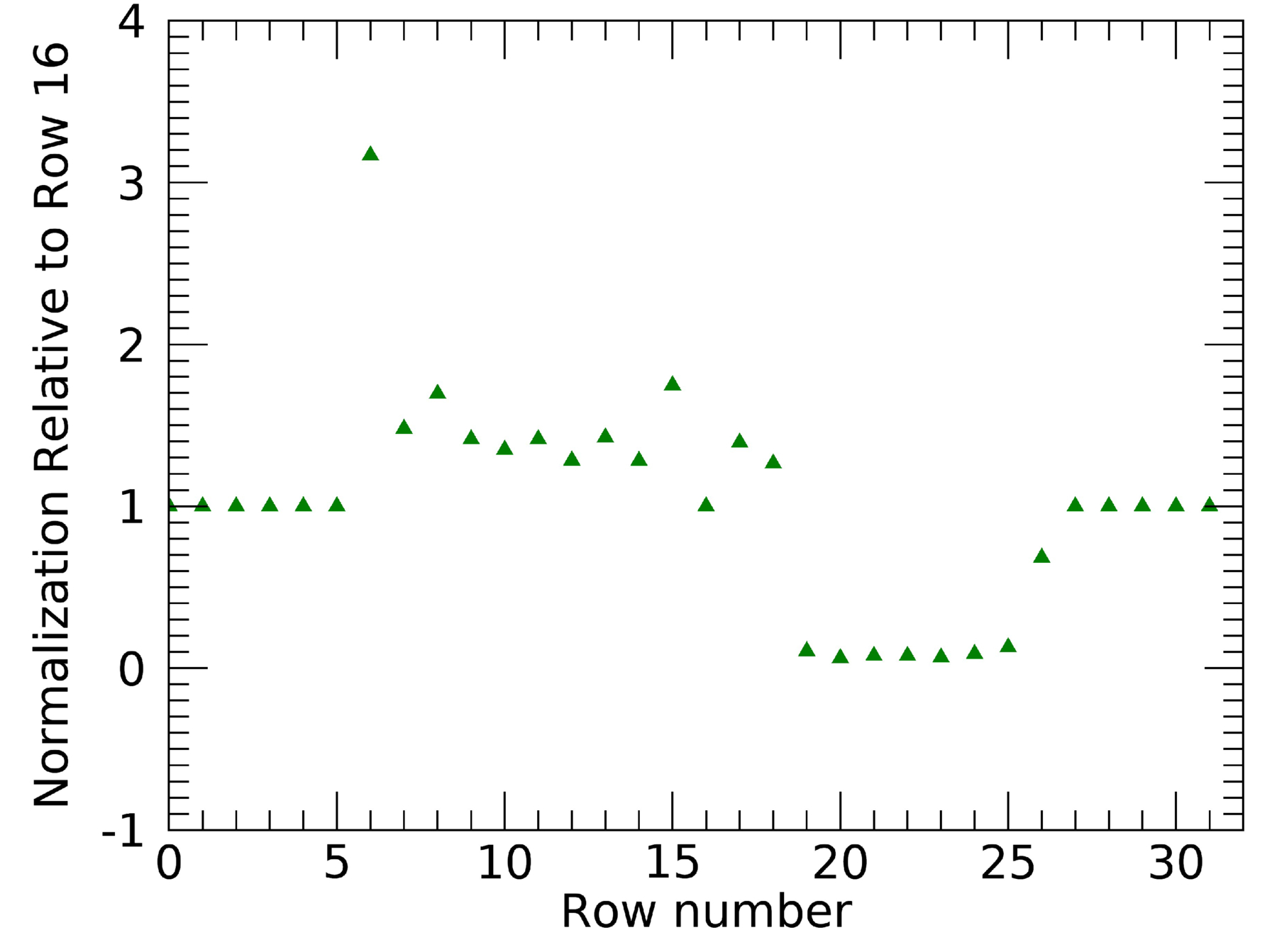 Normalization factor applied to each row to account for relative sensitivity to diffuse/extended sources compared with that in Row 16, which has been extensively calibrated, using a 3600 s dark sky observation. Detector rows 0–5 and 27–31 are outside of the FOV of the slit and are therefore set to 1. The normalization array shown in this figure is applied to each row in the scan observations to calculate the Lyα flux across the Alice FOV.