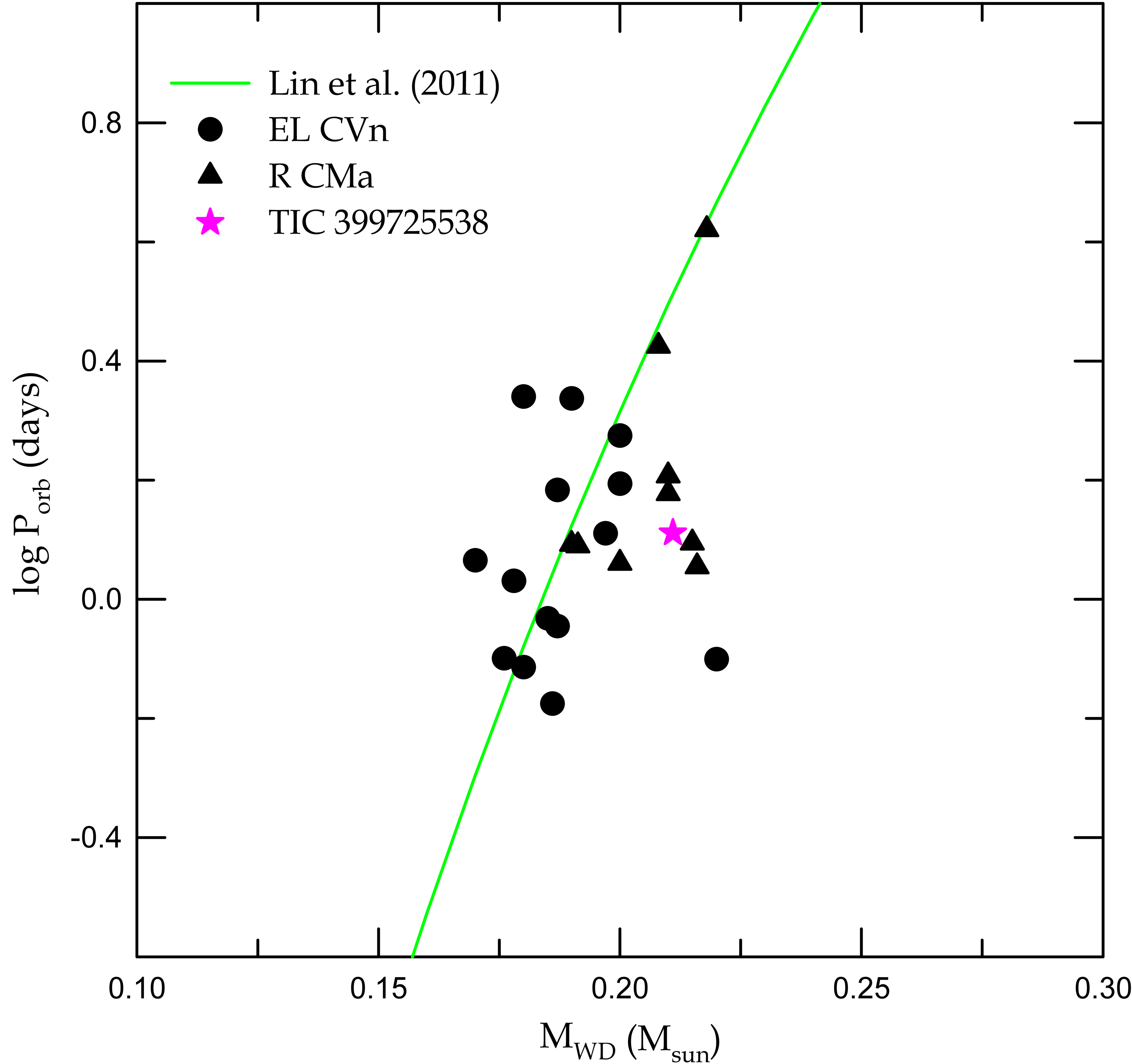 ﹩\mathrm{log}{P}_{{\rm{orb}}}-{M}_{{\rm{WD}}}﹩ diagram for TIC 399725538 B (star symbol) and the other pre-ELM WD companions in double-lined EL CVn-type (circles) and R CMa-type (triangles) binaries, respectively. The green solid line represents the relationship for the stable mass transfer evolution presented by J. Lin et al. (2011).