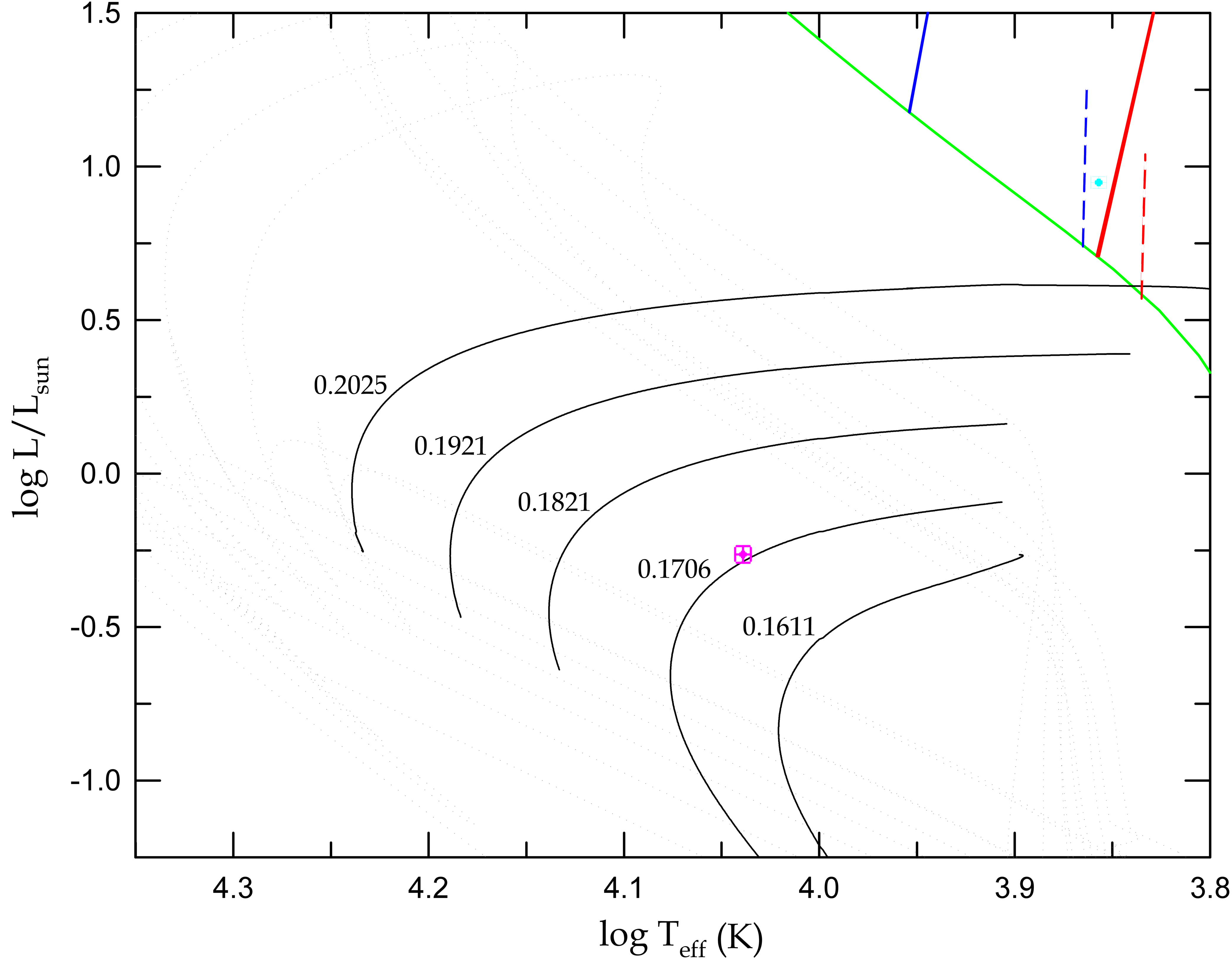 Position of TIC 399725538 A (cyan cross) and B (pink cross) in the H-R diagram. The green solid line represents the zero-age main sequence, while the colored oblique solid and dashed lines indicate the instability strips of δ Sct and γ Dor stars, respectively (see J. W. Lee et al. 2024). The black solid lines denote the evolutionary sequences of ELM WDs with masses from 0.1611 M⊙ to 0.2025 M⊙, up to the first occurrence points of CNO flashes (L. G. Althaus et al. 2013). The dotted gray line shows the full evolutionary track of the 0.2025 M⊙ model.