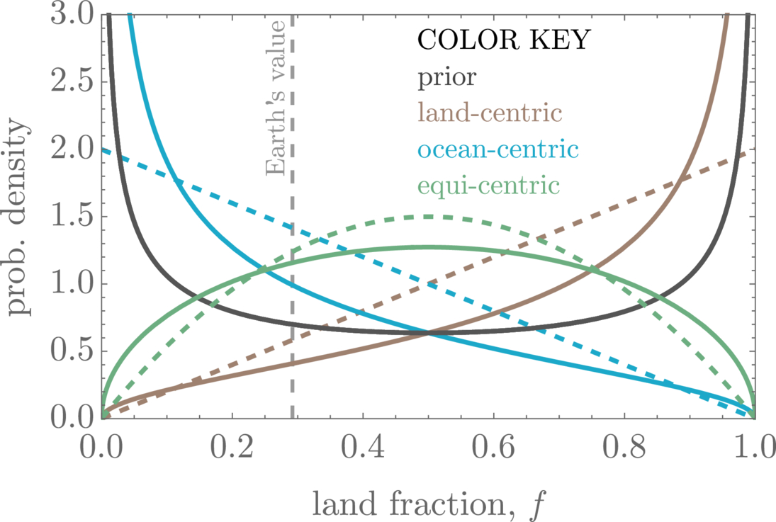 Comparison of the posteriors (solid lines) from our four different fiducial models, labeled inset. The dashed lines represent the likelihood functions of each, and the solid gray line is the prior—which is identical to the fourth model of indifference and thus not explicitly shown.