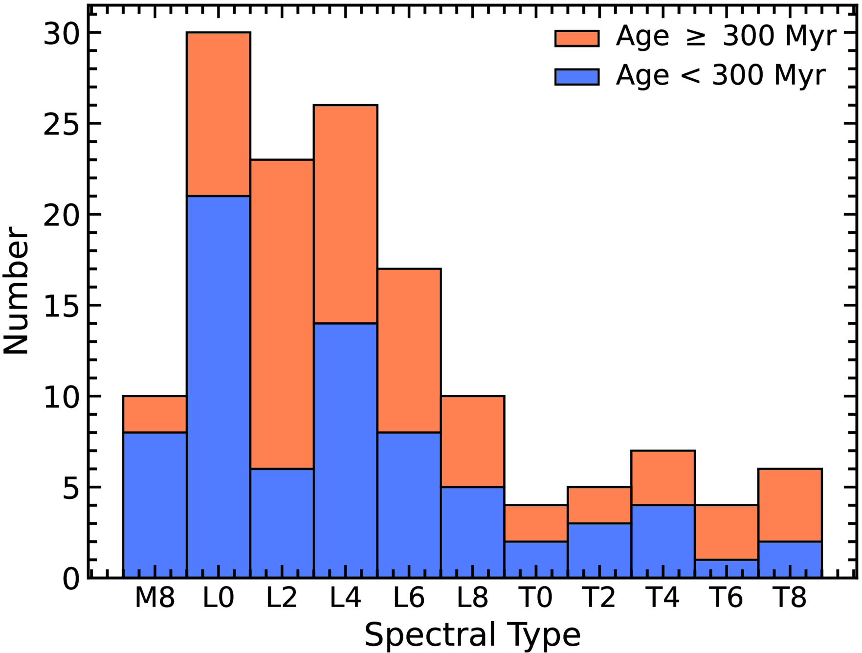 Spectral type distribution of our sample of benchmark brown dwarfs and planetary-mass objects, with ages younger (blue) or older (orange) than 300 Myr.