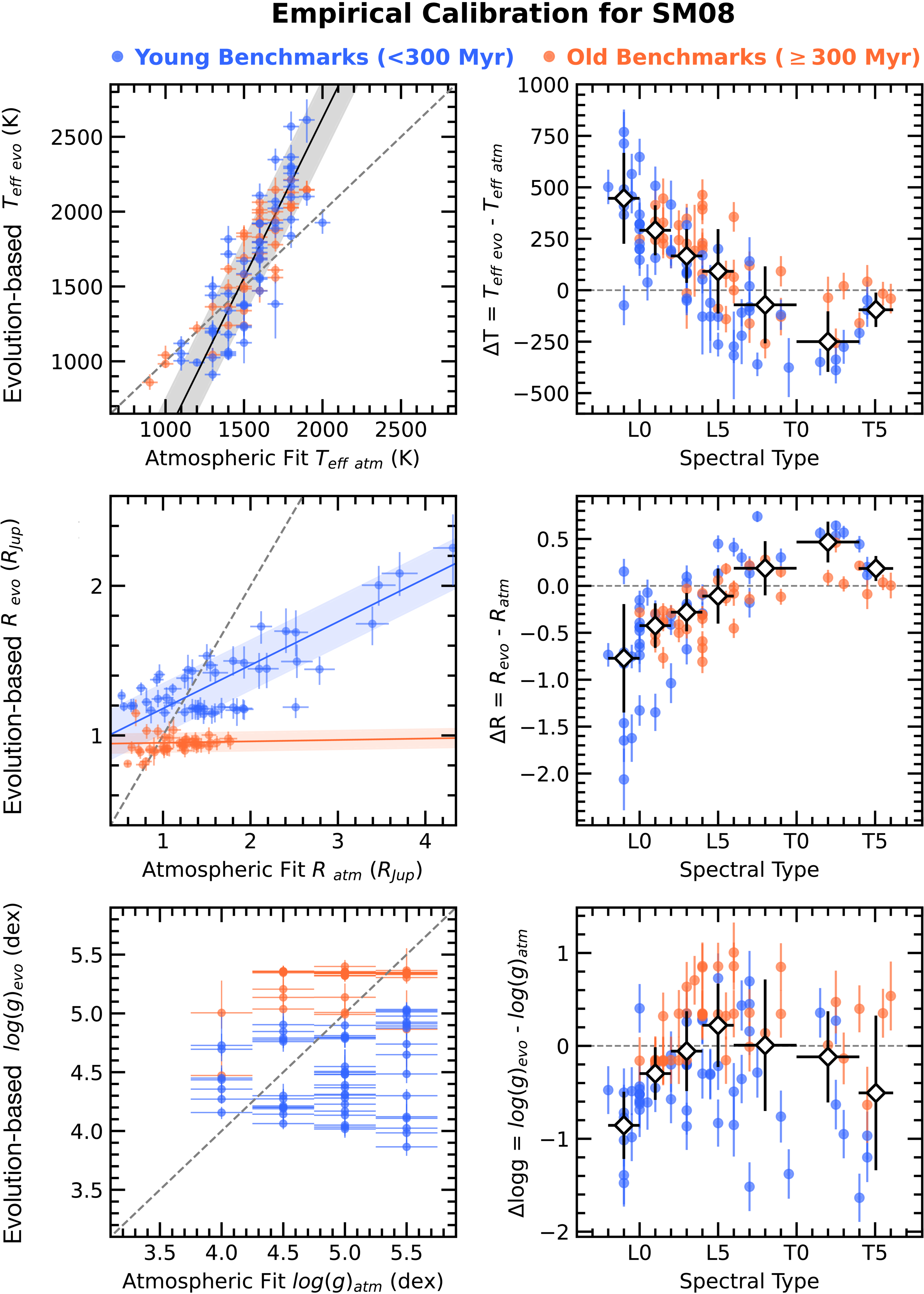 Comparison between spectroscopically inferred values of Teff (top), R (middle), and ﹩\mathrm{log}(g)﹩ (bottom), based on SM08 atmospheric models, with those derived from the Sonora Diamondback evolution models. These panels follow the same format as Figure 11.