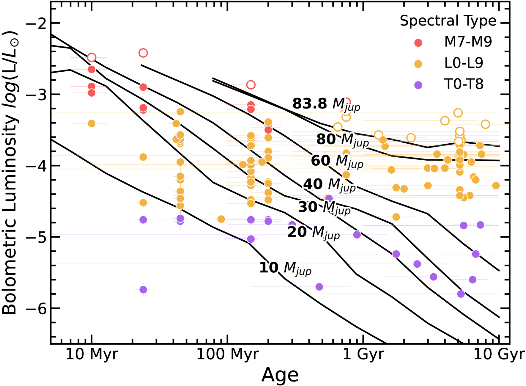 Ages and bolometric luminosities of our benchmark targets (Table 2), color-coded by spectral types. We use open circles to mark the benchmarks excluded from the evolution model analysis, including binaries and several objects whose ages and/or Lbol fall outside the convex hull of the evolution models (see Section 3). The Sonora Diamondback hybrid-grav evolution models (black lines) with [M/H] = 0 dex are overlaid.