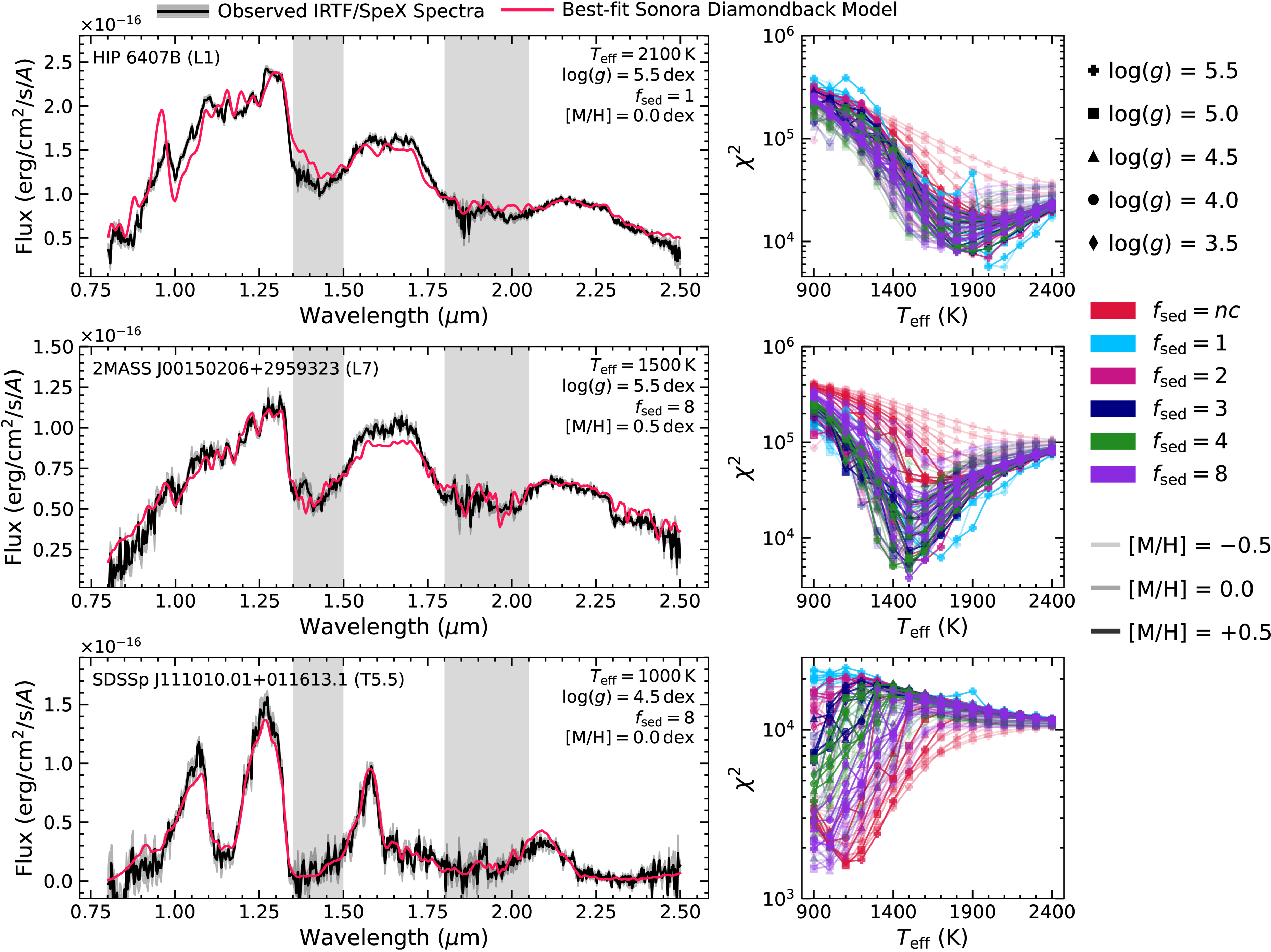 χ2-based spectral fitting results of three representative targets based on the Sonora Diamondback atmospheric models. In the left panels, the observed IRTF/SpeX spectra (black) are compared with the best-fit model spectra (red), and the corresponding best-fit parameters are labeled. Fluxes within the broad water bands (shaded in gray) are masked in spectral fits. The right panels present the χ2 values as a function of effective temperatures, with variations in symbol, color, and transparency indicating different values of ﹩\mathrm{log}(g)﹩, fsed, and [M/H], respectively.