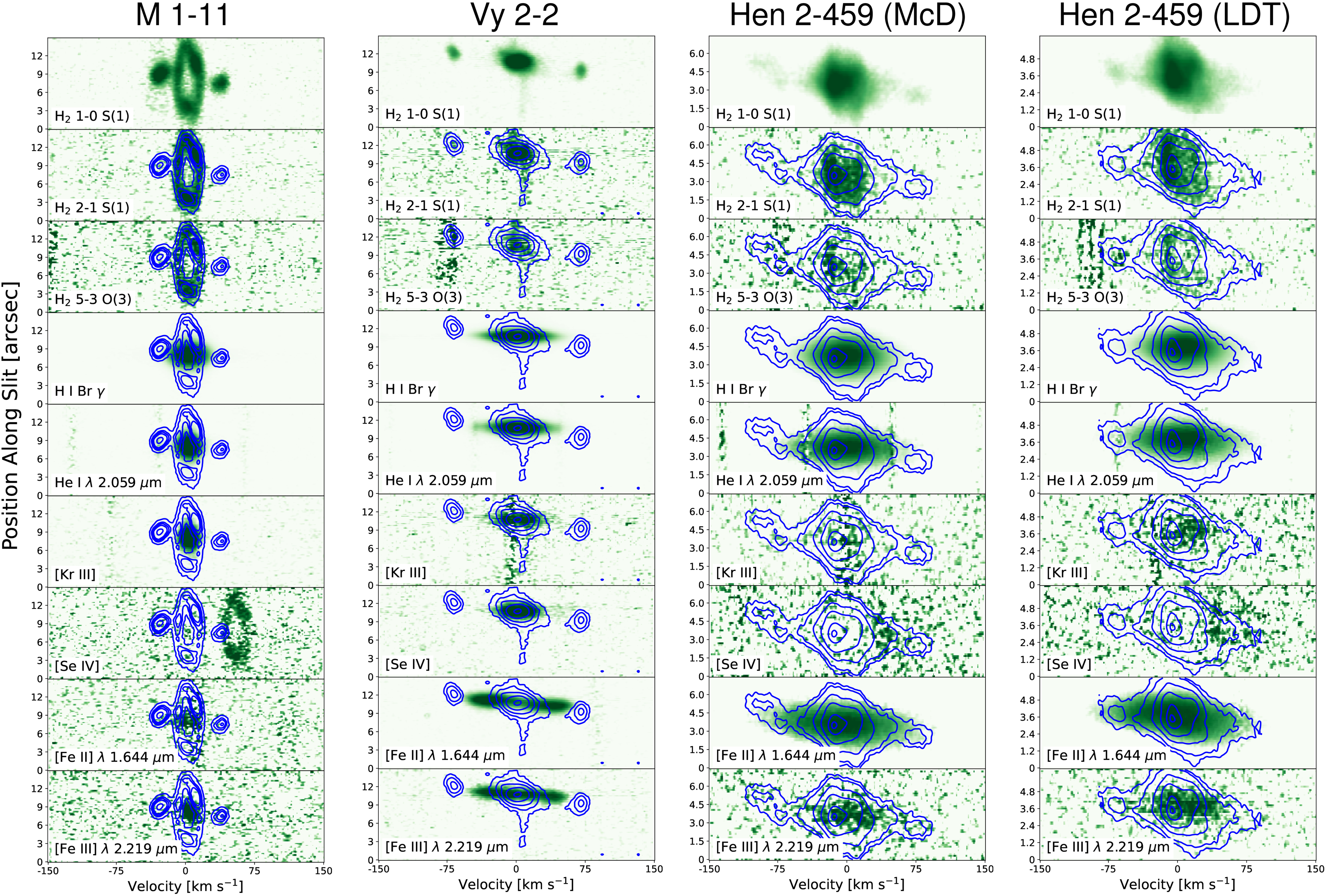 Position–velocity diagrams of selected H2, H I, He I, [Kr III], [Se IV], [Fe II], and [Fe III] lines for M 1-11 (far left), Vy 2-2 (middle left), Hen 2-459 McD (middle right), and Hen 2-459 LDT (far right) observations. The H2 1–0 S(1) line from the top is overplotted over all the other lines as blue contours to facilitate direct comparison of the emission from H2 and other species. The x-axis shows the velocity in kilometers per second relative to the nebular center, and the y-axis shows the spatial position along the slit with the orientation shown in Figure 1. Note that the H2 3-2 S(2) line is ∼50 km s−1 redward of the position of the undetected [Se IV] line in the M 1-11 PV diagram.