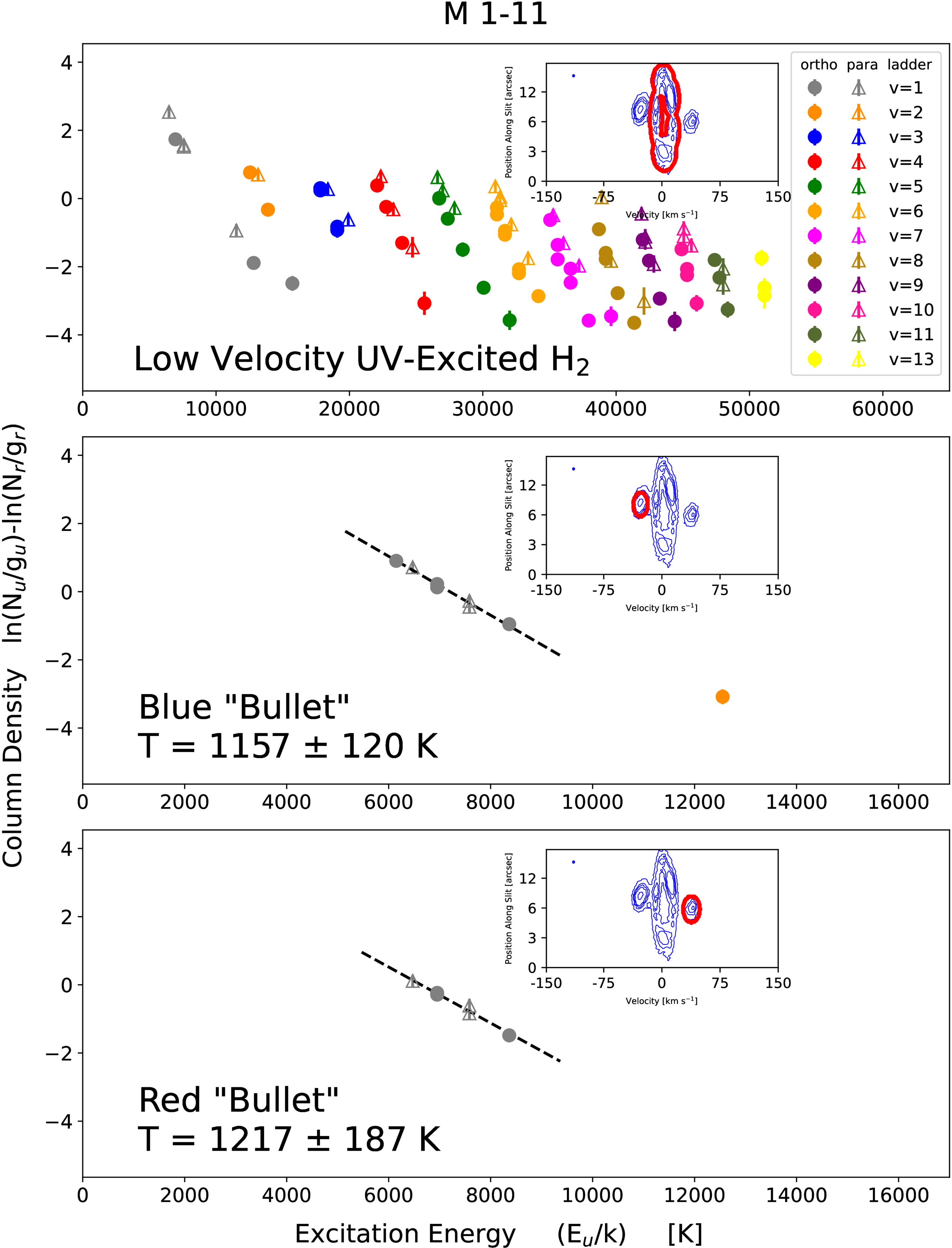 H2 excitation diagrams for M 1-11. The thumbnail PV diagrams show the 1–0 S(1) line and the aperture used to extract each H2 component. The dashed lines show the least-squares linear regression fits to the H2 level populations of each thermal bullet, from which their temperatures are derived.