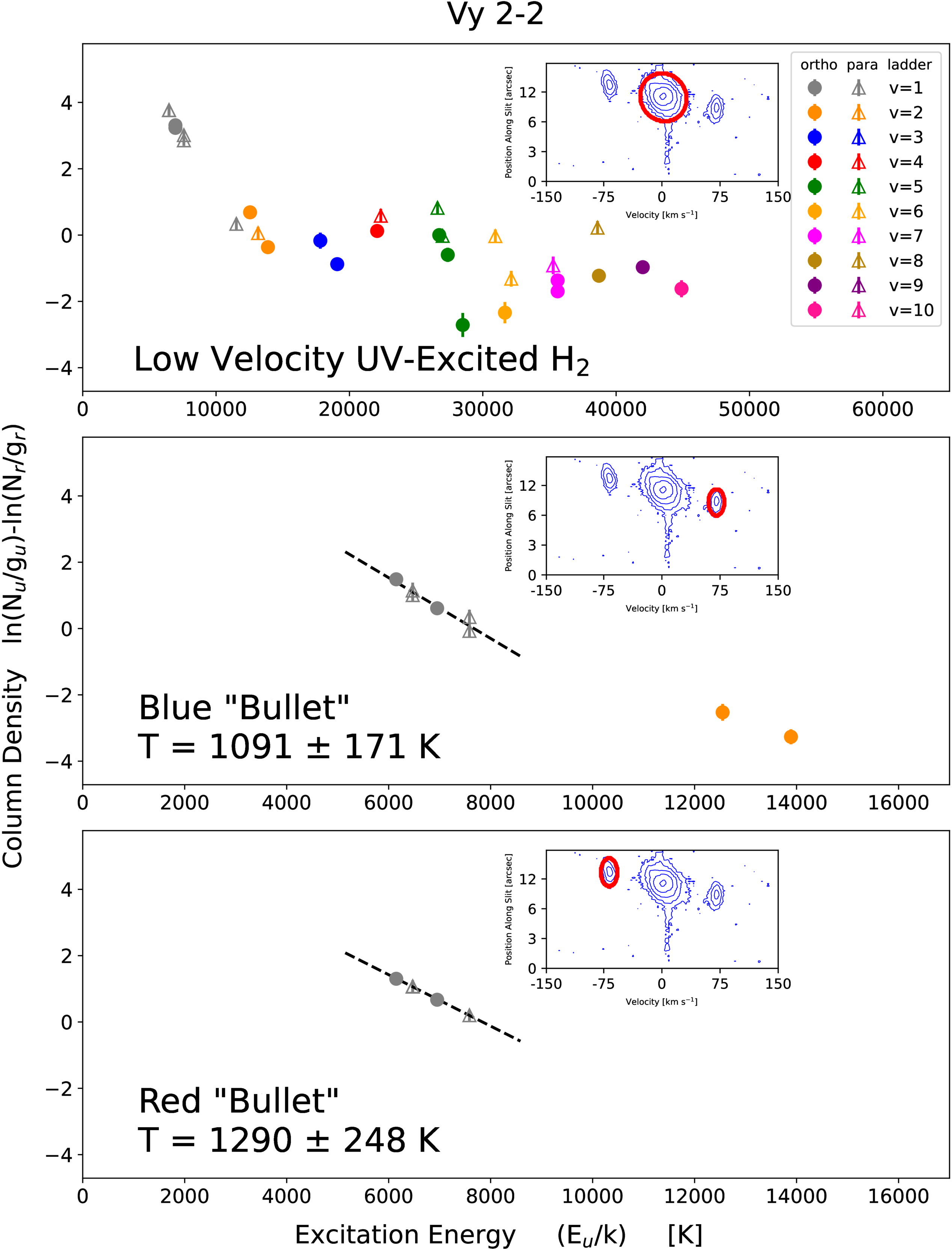H2 excitation diagrams for Vy 2-2. The thumbnail PV diagrams show the 1–0 S(1) line and the aperture used to extract each H2 component. The dashed lines show the least-squares linear regression fits to the H2 level populations of each thermal bullet, from which their temperatures are derived.