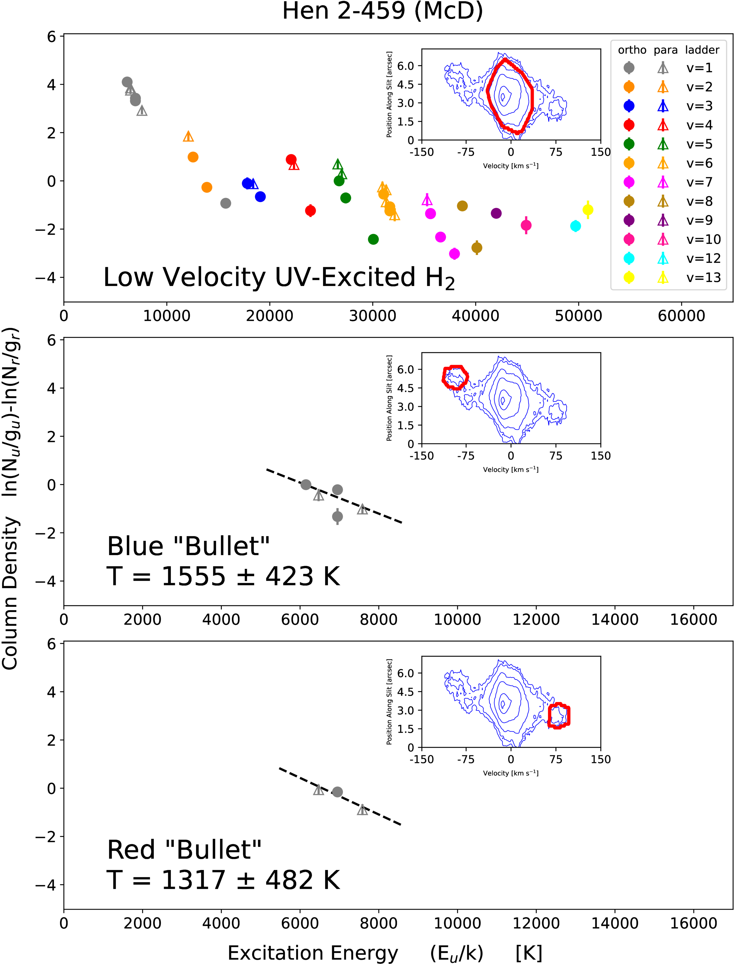 H2 excitation diagrams for McD observations of Hen 2-459, observed with a slit PA of 225°. The thumbnail PV diagrams show the 1–0 S(1) line and the aperture used to extract each H2 component. The dashed lines show the least-squares linear regression fits to the H2 level populations of each thermal bullet, from which their temperatures are derived.