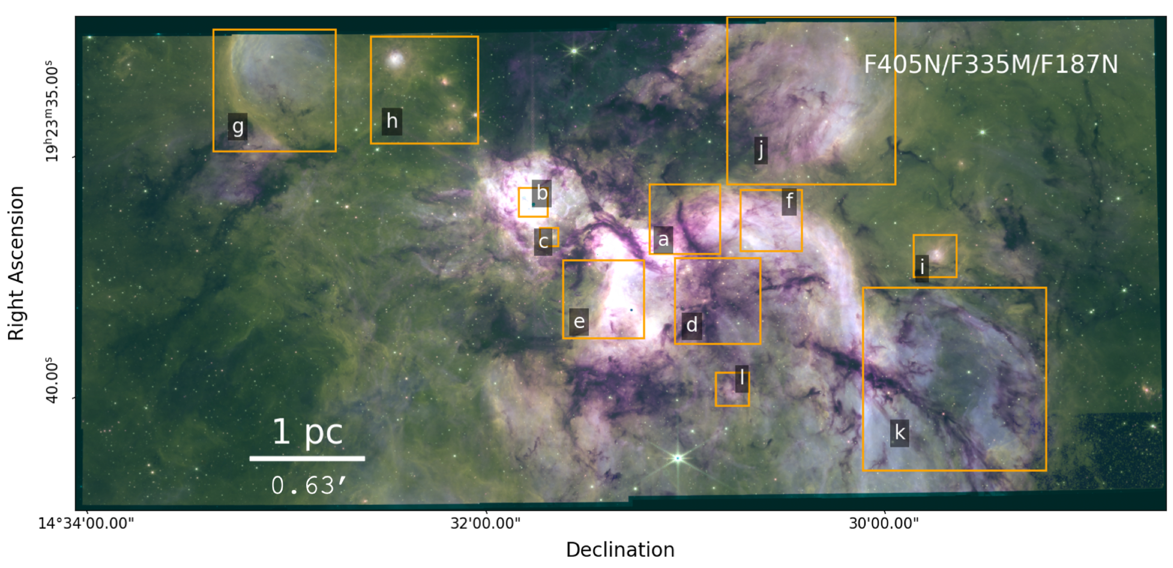 W51A NIRCam overview showing a F405N (red)/F335M (green)/F187N (blue) composite image. The positions of the cutouts for the zoomed-in images displayed in Figure 5 are marked.
