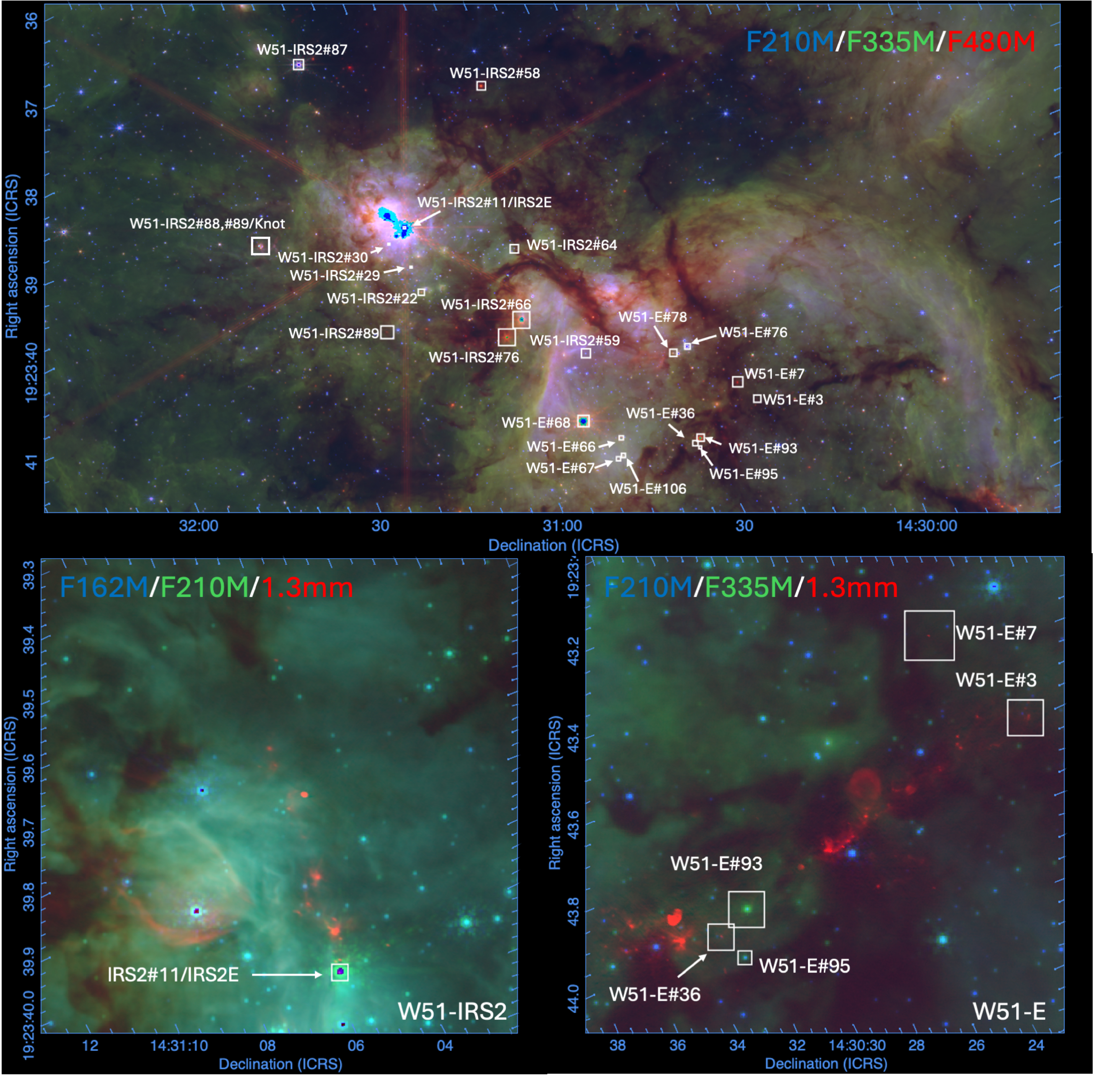 ALMA-JWST matched sources. The locations of the matching sources are marked in the upper panel with the background image of F162M, F210M, and F480M filters. In the lower panels, W51-E and W51-IRS2 protocluster regions are zoomed in with the background image of the JWST NIRCam filters and ALMA 1.3 mm image combined.