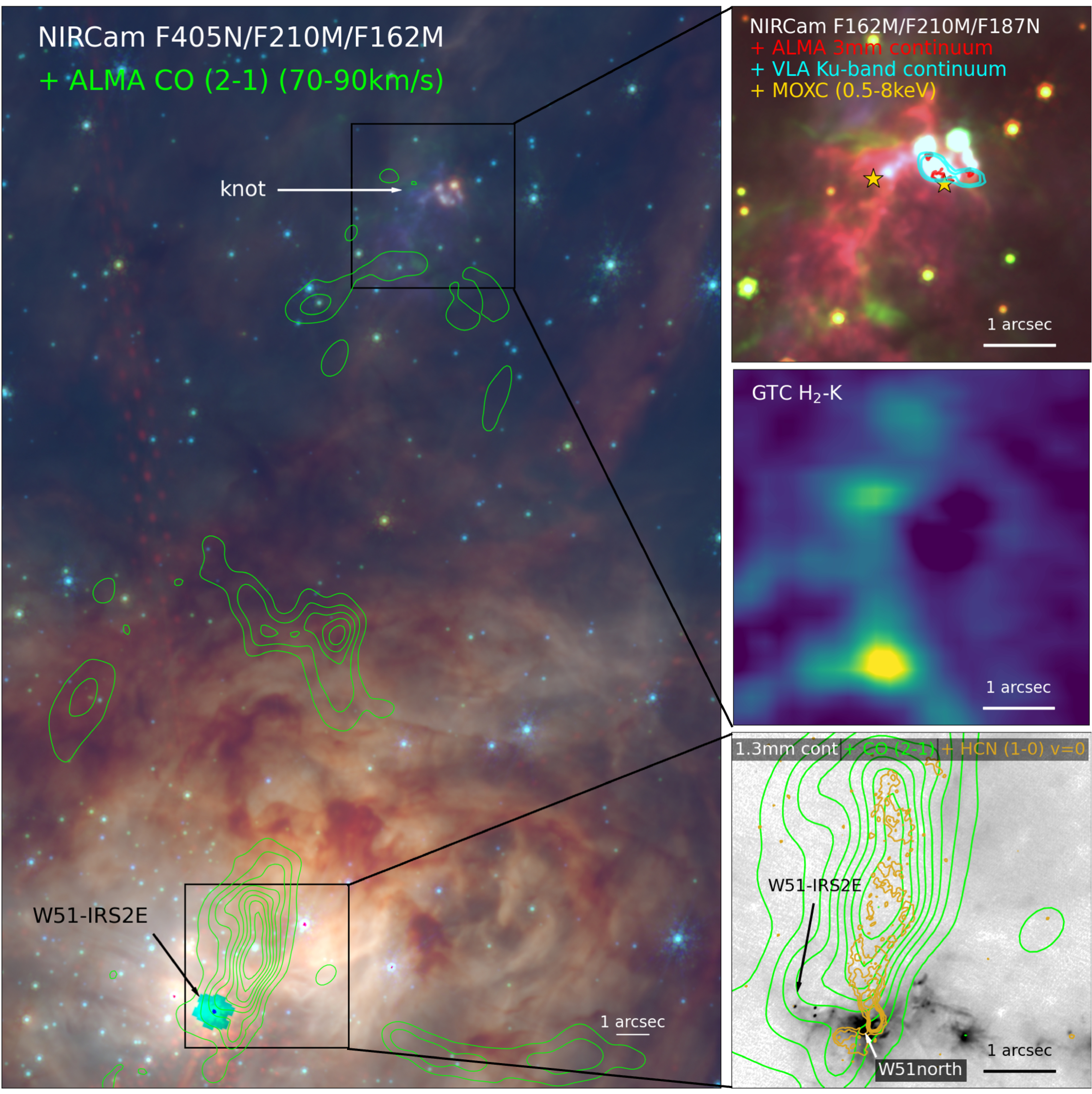 Outflow structure around W51-IRS2. The orientation of all panels is aligned with ICRS coordinates. Left: the background image is a composite of NIRCam F162M (red), F210M (green), and F405N (blue). The green contour shows the ALMA CO (2–1) moment 0 map from the ALMA-IMF large program (F. Motte et al. 2022; N. Cunningham et al. 2023) with a radial velocity range of 70–90 km s−1. Upper right: a zoomed-in composite of F162M (red), F210M (green), and F187N (blue) for the outflow knot. The red contour displays the ALMA 3 mm continuum above 3σ = 5.25 mJy beam−1 from ALMA observation 2017.1.00293.S (A. Ginsburg & C. Goddi 2019). The cyan contour exhibits the VLA Ku-band continuum. Middle right: GTC H2-K image (A. Dawson et al. 2025) for the knot cutout. Lower right: another zoomed-in image around W51-IRS2E and W51north. The background image is an ALMA 1.3 mm long baseline (2015.1.01596.S; A. Ginsburg & C. Goddi 2019) image created by feathering with the ALMA-IMF image. ALMA CO (2–1) (green contour) and HCN (1–0) v = 0 (yellow contour) moment maps are displayed as well.
