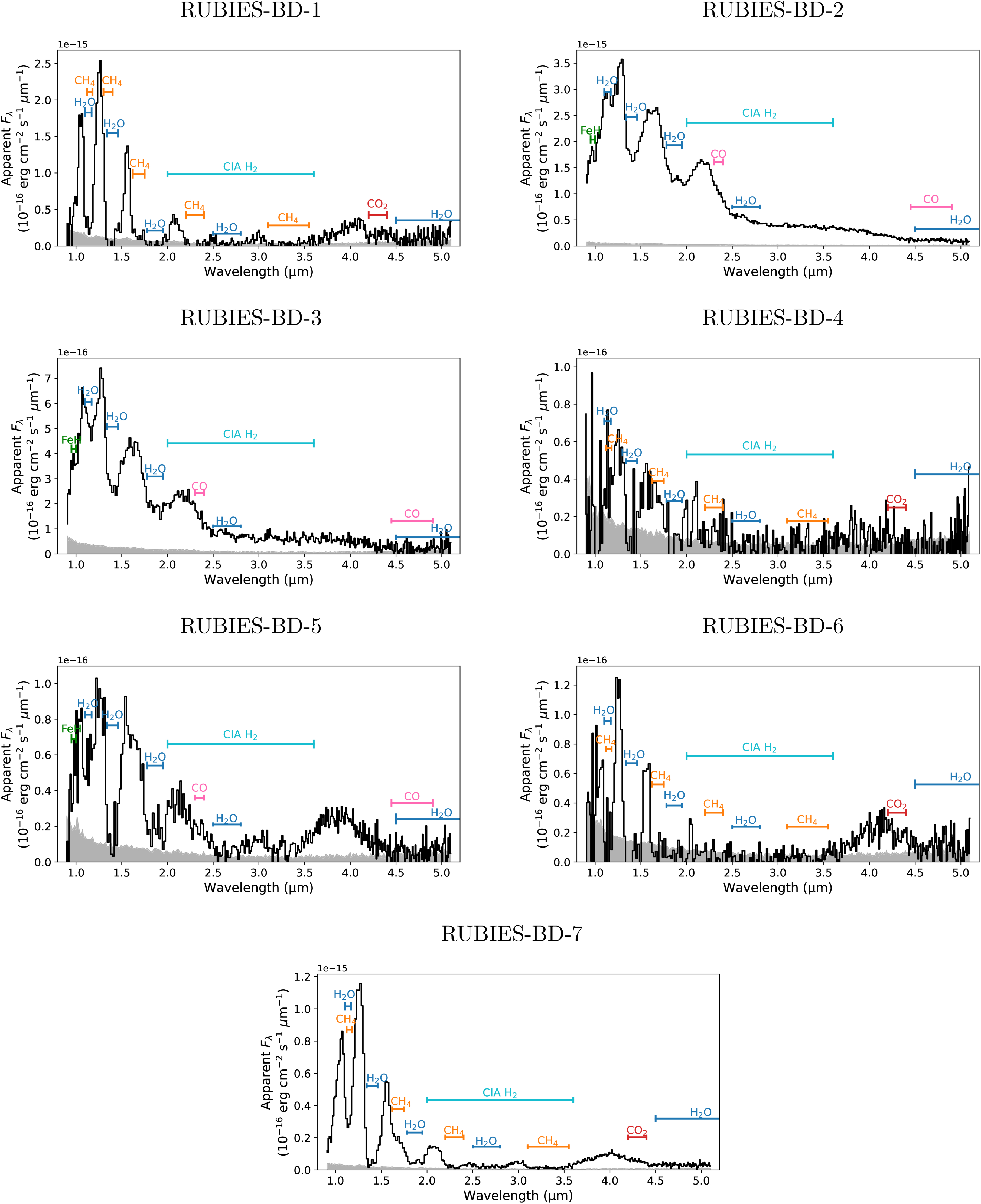 NIRSpec/prism spectra of the seven RUBIES brown dwarfs identified in this study (black lines). Spectra are shown in apparent Fλ flux densities after scaling to their F444W magnitudes, and uncertainties are indicated in gray. Key spectral features present in the 1–5 μm spectra of L and T dwarfs are labeled.