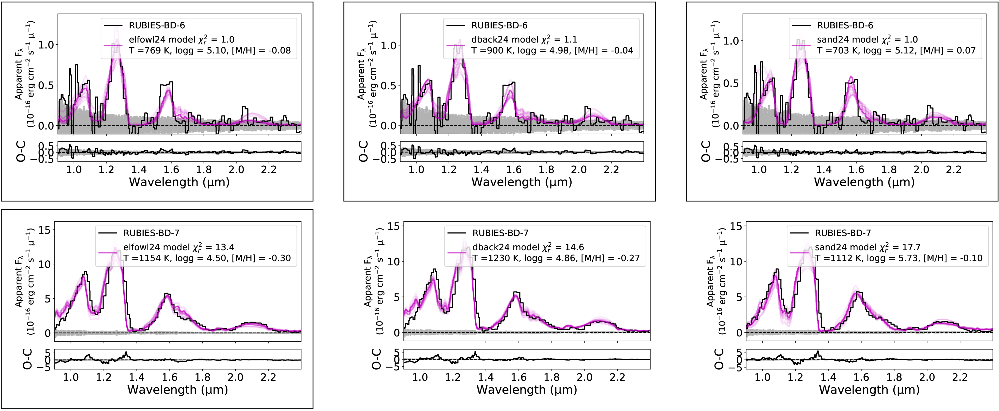 MCMC fits to NIRSpec/prism data constrained to the NIR (0.9–2.4 μm) range. Each row corresponds to one of the RUBIES brown dwarf spectra scaled to the apparent F444W magnitude (black lines), while the columns separate fits to the Elf Owl (left), Diamondback (middle) ,and SAND (right) models. Both the best-fit models (solid magenta lines) and draws from the posterior distribution (semitransparent magenta lines) are shown, and the ±1σ spectral uncertainties are indicated by the gray band. Below each spectral comparison, we compare the difference between the source and best-fit model fluxes (O – C as black lines) to the ±1σ spectral uncertainties (gray bands). Panels that are surrounded by boxes indicate models that provide the best fits, including equivalent cases (see Table 6).