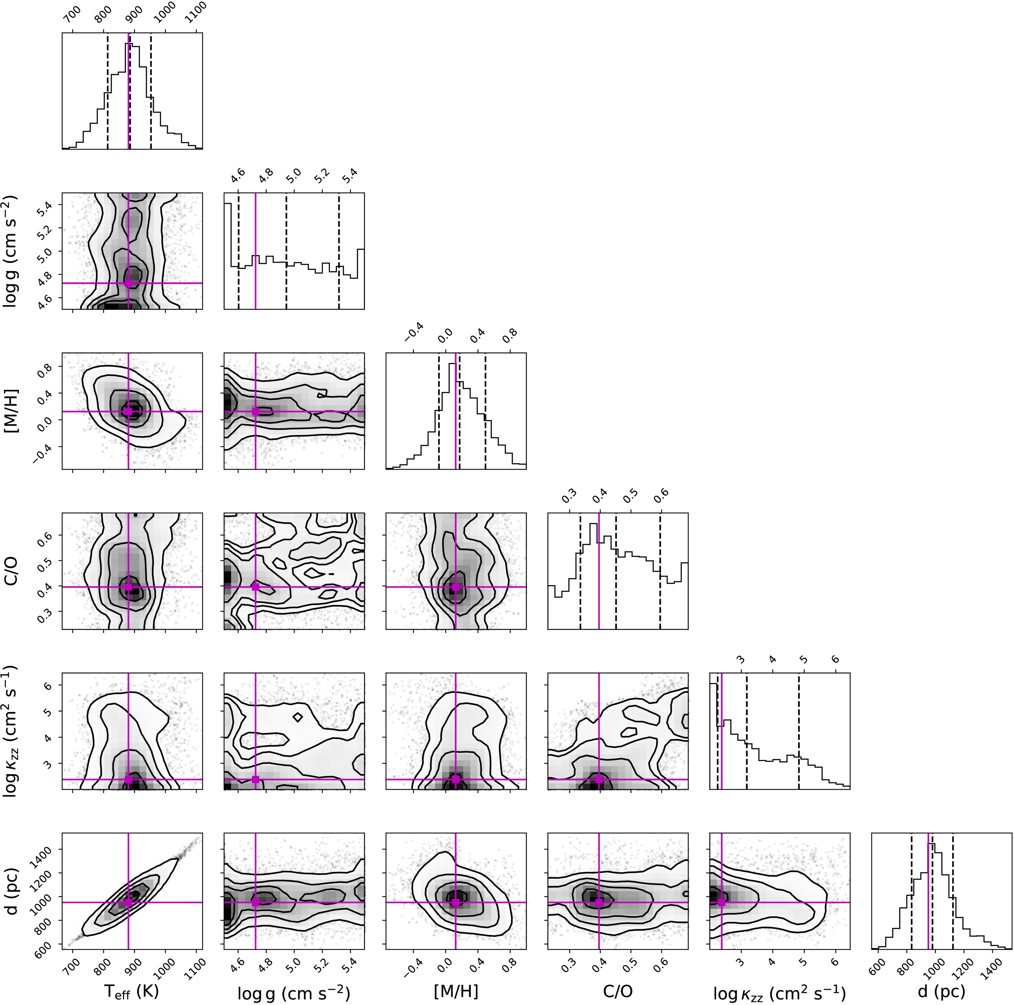 Example corner plot of Elf Owl fits to NIRSpec/prism data for RUBIES-BD-1. Diagonal panels display the marginalized posterior distributions for Teff, ﹩\mathrm{log}{\rm{g}}﹩, [M/H], C/O, ﹩\mathrm{log}{\kappa }_{{\rm{zz}}}﹩, and distance, while the inner panels display contour plots of distributions marginalized over parameter pairs to illustrate correlations. Contour shading indicates likelihood values, and lines trace 25%, 50%, and 75% likelihood thresholds. Magenta lines indicate the parameter values for the best-fitting individual model, while the vertical dashed lines in the marginalized distributions indicate the 16%, 50%, and 84% quantiles.