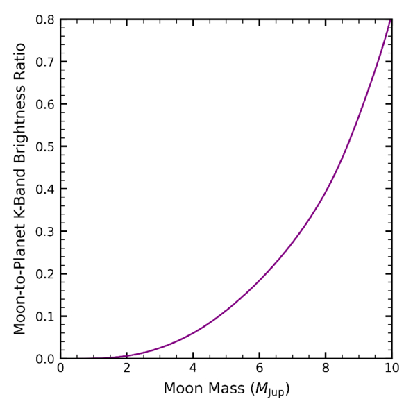 Relationship between the K-band brightness ratio of β Pic b and a hypothetical moon as a function of the moon’s mass. At lower moon masses, the K-band brightness contribution of the hypothetical moon is minimal compared to its host planet, motivating our assumption that any moons in the system are dark compared to the host planet.