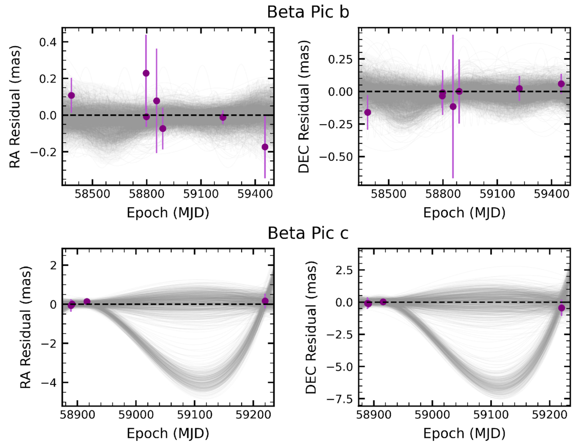 R.A. and decl. residuals for the GRAVITY observations of β Pictoris b and c with respect to our best-fit “two-planet” model. Purple points and associated error bars mark the GRAVITY astrometric measurements, with uncertainties inflated by the best-fit error-scaling parameter. The top row presents the residuals for β Pictoris b, while the bottom row displays the corresponding residuals for β Pictoris c. The gray lines represent 1000 randomly selected posterior draws from our “two-planet and moon” fit. We see no correlated residuals to the “two-planet” model, indicative of an unmodeled signal, and we see no coherent pattern to the posterior draws for planet b, which includes hypothetical lunar perturbations. We note that the posterior samples of β Pic c show some evidence for bimodality due to the relatively sparse sampling of the planet’s orbit with GRAVITY.
