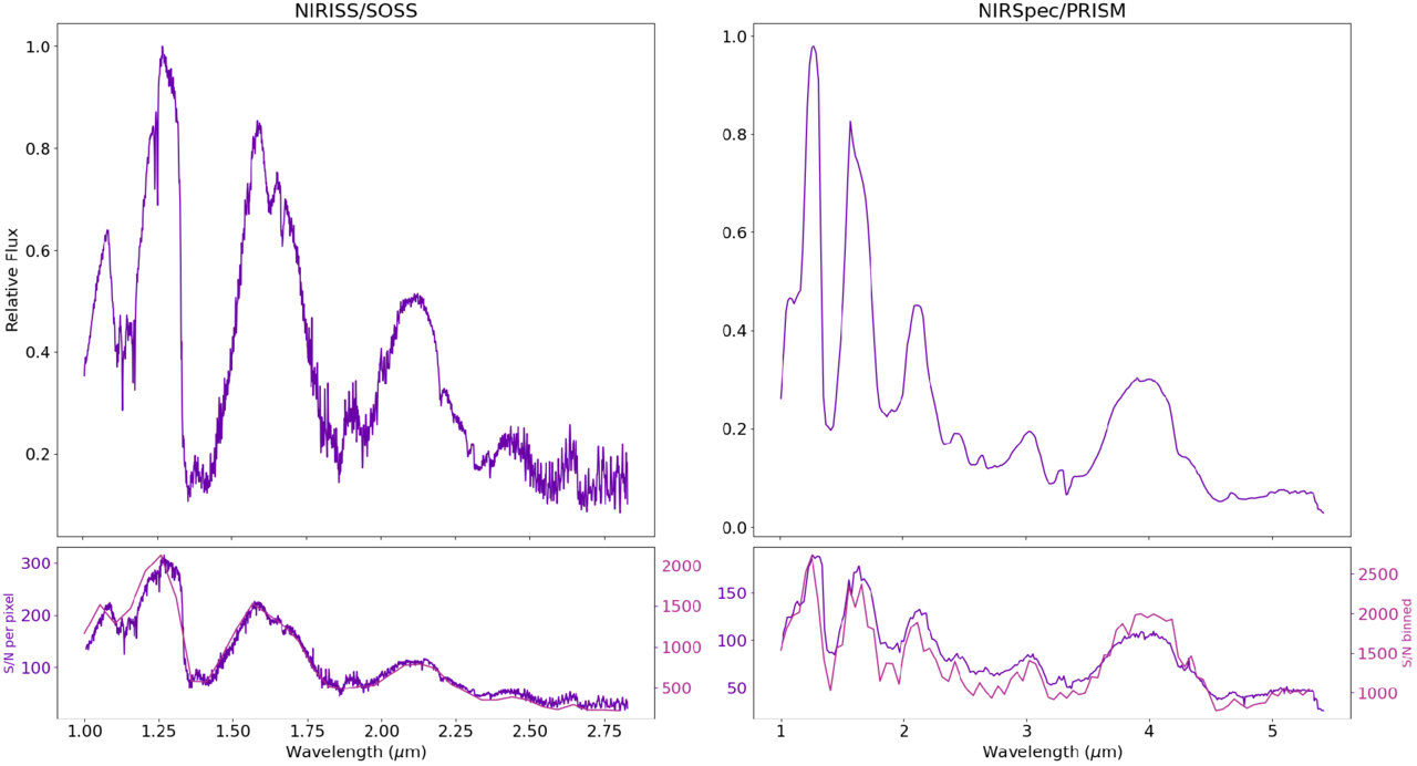 NIRISS/SOSS (left) and NIRSpec/PRISM (right) spectra for SIMP J0136. Top row: time-averaged spectra normalized to maximum emission. Bottom row: per pixel (purple) and spectrally and temporally binned (magenta) S/N. The NIRISS/SOSS and NIRSpec/PRISM data were previously presented in R. Akhmetshyn et al. (2025) and A. M. McCarthy et al. (2025), and E. Nasedkin et al. (2025), respectively.