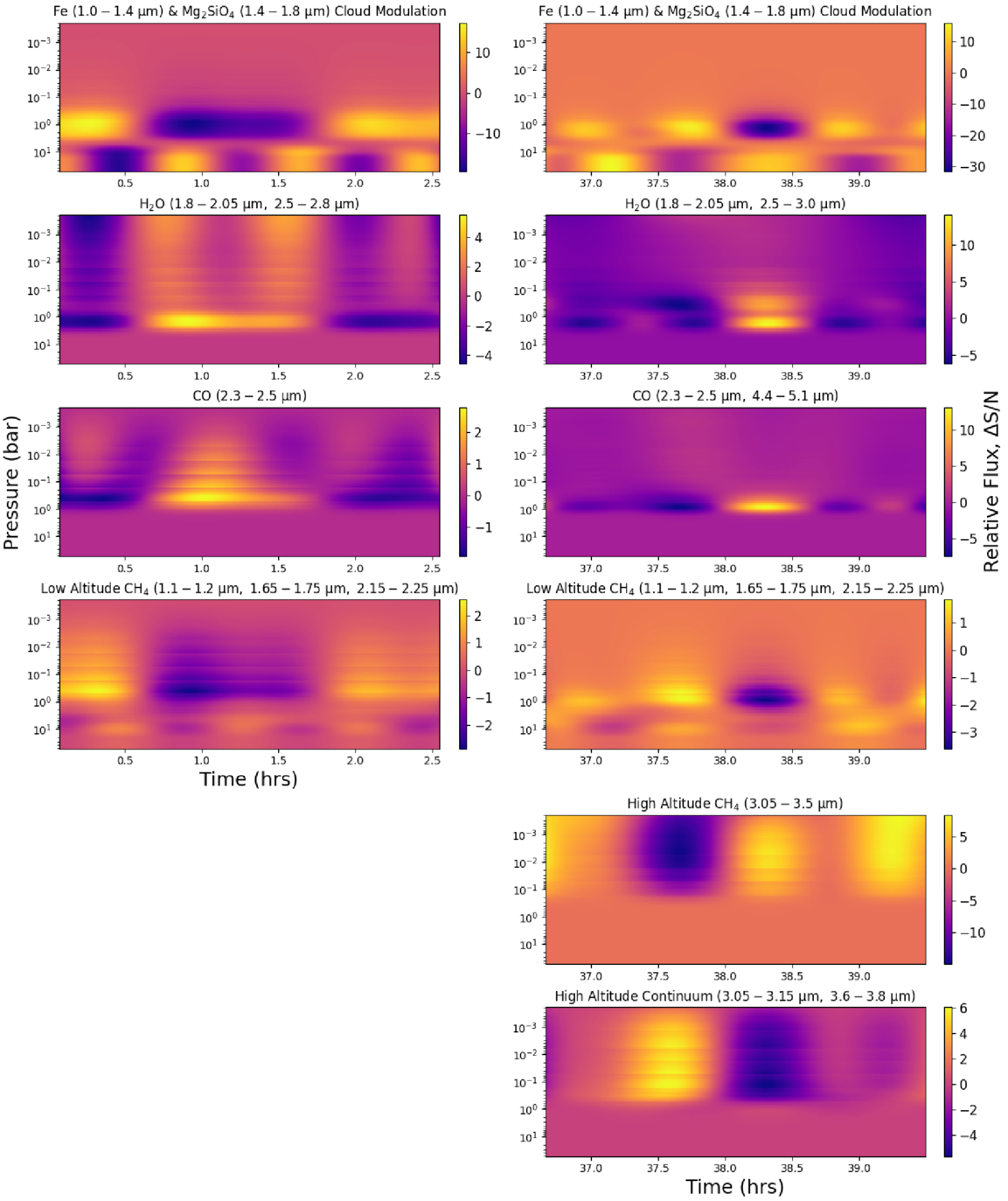NIRISS/SOSS (left) and NIRSpec/PRISM (right) spectral features’ deviations from bulk variability for SIMP J0136. Top row: presumed iron (lower layer, 1.0–1.4 μm) and forsterite (upper layer, 1.4 –1.8 μm) cloud modulation. Wavelengths are based on models and previous observations of cloud-influenced pressure levels and wavelengths for SIMP J0136 (see, e.g., J. M. Vos et al. 2023; A. M. McCarthy et al. 2025). Second row: H2O deviation map, anticorrelated with forsterite cloud modulation. Third row: CO deviation map, anticorrelated with forsterite cloud modulation. Fourth row: low-altitude CH4 deviation map, correlated with forsterite cloud modulation. Fifth row: (NIRSpec/PRISM only) high-altitude CH4 deviation map. The deviations possess similar harmonic periodicity of a low-altitude CH4 feature above the cloud tops but with a reverse sign, tentatively indicating emission at higher altitudes. Bottom row: (NIRSpec/PRISM only) high-altitude continuum deviation, correlated with forsterite cloud modulation.