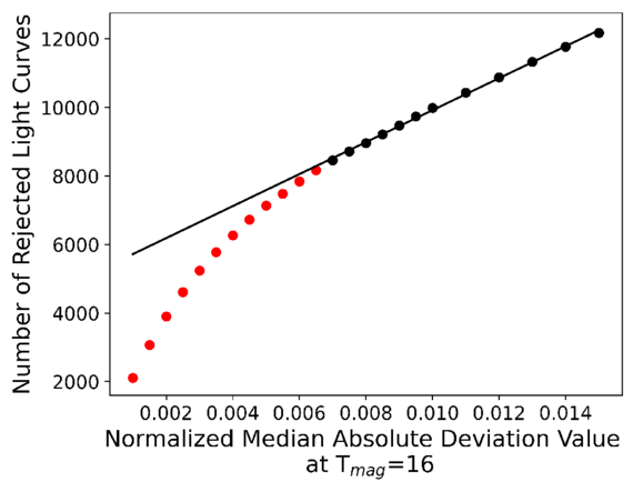 Comparison between the selected Tmag = 16 normalized median absolute deviation value used as an anchor point for our Poisson-like noise cutoff and the number of rejected stars at that noise cutoff. At a normalized median absolute deviation anchor point of 0.0065 the function becomes linear out to brighter median absolute deviation cutoffs (shown in black). Due to significant contamination from nearby bright neighboring stars, the normalized median absolute deviation values of some target stars fall below the expected noise limit. The transition at 0.0065 represents the point where our noise cutoff removes these poorly fit light curves.