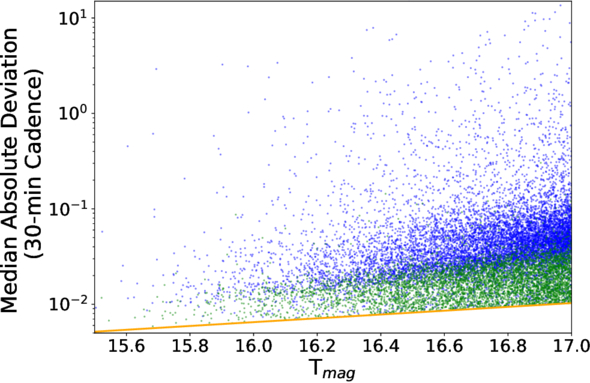The normalized median absolute deviation of each light curve in our survey as a function of Tmag, where the 9768 light curves reduced with TGLC are shown blue and the 5408 light curves reduced with eleanor are shown in green. For the faint target stars observed in the most crowded fields of our survey, significant contamination from nearby bright neighboring stars can lead to light curves with median absolute deviation values that fall below the predicted noise limit (A. D. Feinstein et al. 2019). To remove these highly contaminated light curves, we plotted the number of stars rejected at a series of Poisson-like noise cutoffs and selected the cutoff where the function began to deviate from the linear function seen at brighter median absolute deviation cutoffs (see Figure 1). We show this selected noise cutoff as an orange curve in the scatter plot.