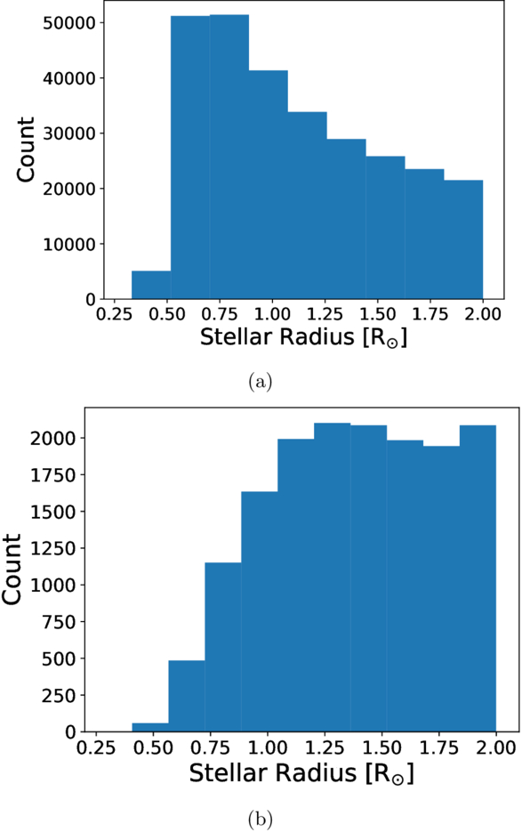 (a) The stellar radius distribution of the stars from P. Ramos et al. (2022) with our cuts of R* < 2 R⊙ and Sagittarius membership probability >50% across the full magnitude range of G < 19.75. The median stellar radius of this distribution is 1.04 R⊙. (b) The stellar radius distribution for the 15,176 stars in our survey with our cuts of R* < 2 R⊙, Sagittarius membership probability >50%, and Tmag < 17. The median stellar radius of this distribution is 1.38 R⊙.
