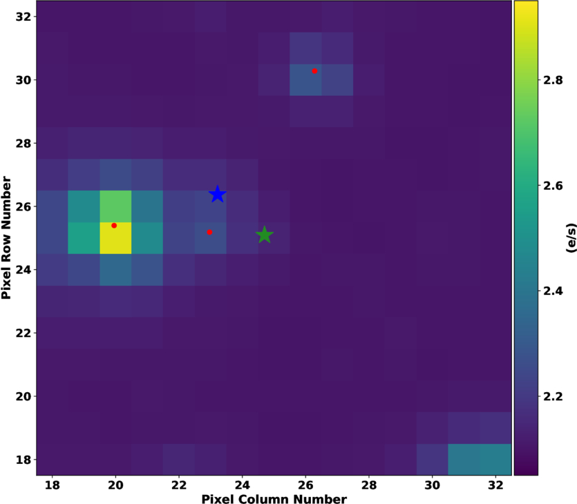A 15 × 15 full-frame image cutout centered on the target star TIC 92223525 (green star). The red circles represent the neighboring stars in the Gaia DR3 catalog with Tmag < 17, and the blue star represents the neighboring star TIC 92223526 we identified as the source of the observed candidate transit signal. With a separation of just ∼2 TESS pixels, we estimate that the light curve of TIC 92223525 was contaminated by 11.5% of the observed flux from the neighboring star TIC 92223526, which we believe to be an eclipsing binary.