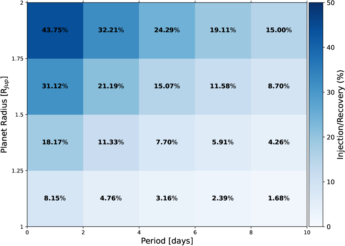 Injection recovery rates for 2481 targets from our survey of 15,176 stars in the Sagittarius dwarf galaxy stream. For each star we performed 10,000 recovery tests, where each injection included a planet with parameters that were drawn from uniform random samples of radii between 1RJup and 2RJup and orbital periods less than 10 days. Each box represents a bin of 2 days on the X-axis and 0.25RJup on the Y-axis. The center of each box is labeled with the percent of signals recovered from within that bin calculated as (total successful recoveries/total injections) × 100. The overall color gradient reflects the recovery percentage value.