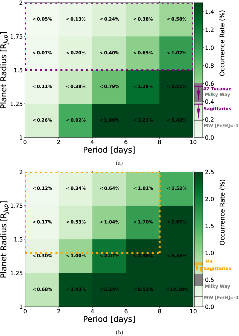 The first upper limit on the hot Jupiter occurrence rate in the Sagittarius dwarf galaxy across a radius range of 1RJup–2RJup with orbital periods < 10 days. Occurrence rates at the 68% and 95% confidence levels are shown in panels (a) and (b), respectively, and were calculated using Equation (6). The values at the center of each box represent the occurrence rate upper limit for that bin in planetary parameters shown as a percent. For 1RJup–2RJup hot Jupiters with periods of 0.6–10 days we calculate an average 1σ occurrence rate upper limit of <1.01%. In panel (a) we compare our results to the 1σ occurrence rate upper limit of <0.57% calculated by A. L. Crisp et al. (2025) for the globular clusters 47 Tucanae within the parameter space of 1.5RJup–2RJup and <10-day periods outlined by the dotted purple box. Within the same parameter space we find a 1σ occurrence rate upper limit value of <0.37% for the Sagittarius dwarf galaxy stream. In panel (b) we compare our results to the 2σ occurrence rate upper limit of <0.81% calculated by J. J. Wallace et al. (2020) for the globular cluster M4 within the parameter space of 1.4RJup–2RJup and <8-day periods outlined by the dotted orange box. Within the same parameter space we find a 2σ occurrence rate upper limit value of <0.78% for the Sagittarius dwarf galaxy stream. The color bars of each panel are labeled with the calculated upper limits for each region within the highlighted parameter space. The gray box on each color bar represents the range of 0.4%–0.6% for hot Jupiter occurrence rate seen in the Milky Way, and the gray bar labeled “MW [Fe/H] = −1” represents the Milky Way hot Jupiter occurrence rate scaled to an [Fe/H] = −1 representative of the low-metallicity environment of the Sagittarius dwarf galaxy stream.