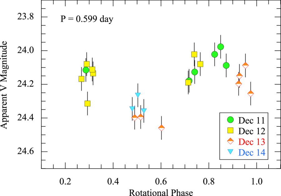 Two-peaked lightcurve computed for the period P = 0.599 day (14.4 hr), corresponding to Ω1 in Figure 2. Data are distinguished by the UT 2017 December date on which they were obtained, as marked.