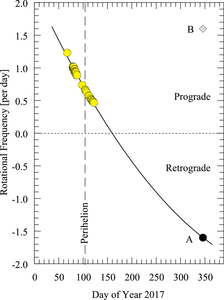 Rotational frequency as a function of time expressed as Day of Year in 2017. The yellow-filled circles show data from D. Bodewits et al. (2018) and D. G. Schleicher et al. (2019). Points A (black-filled circle) and B (gray diamond) show the two solutions for prograde and retrograde rotation deduced from the HST lightcurve. The solid black line is a parabola added to guide the eye. Frequencies above (below) the dashed horizontal line are prograde (retrograde). The date of perihelion is indicated by a dashed vertical line.