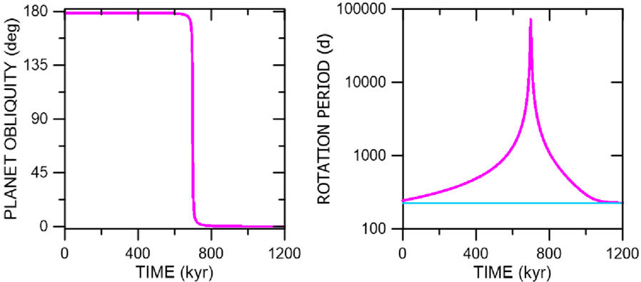 Rotation reversal. Left: tidal reversal of the planet obliquity. Right: evolution of the rotation period (red) and the orbital period (blue).