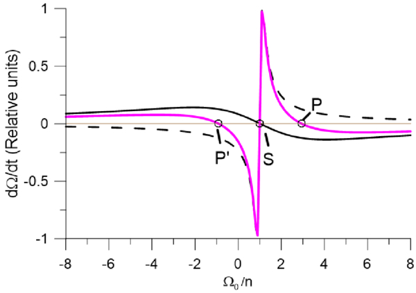 Phase diagram ﹩\dot{{\rm{\Omega }}}({\rm{\Omega }})﹩ resulting from the composition (red) of the tidal (solid black) and atmospheric (dashed) torques. The intersections of the red curve with the axis ﹩\dot{{\rm{\Omega }}}=0﹩ (brown) are the stationary solutions: The unstable synchronous solution ﹩{\mathsf{S}}﹩ and two stable asynchronous solutions ﹩{\mathsf{P}}﹩ and ﹩{{\mathsf{P}}}^{{\prime} }﹩, one prograde and one retrograde. The adopted factors γ and ﹩{\gamma }^{{\prime} }﹩ were exaggerated to improve the visibility of the plot’s main features.