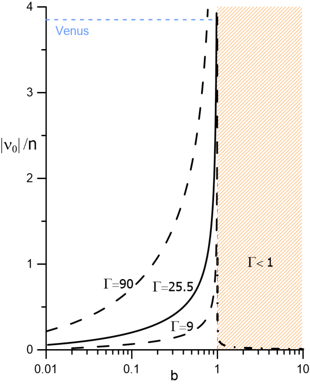 Loci of the asynchronous stationary solutions for given values of Γ. These solutions are stable if they fall in the zone b < 1 and unstable otherwise. If ∣ν0/n∣ < 1, they are both prograde. If ∣ν0/n∣ > 1, one is prograde and the other is retrograde.