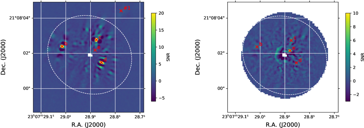 JWST/NIRCam F444W image with color stretch optimized to emphasize the planets. While planets b, c, and d stand out in the initial postprocessed image (left), planet e is not readily apparent. This is partly due to its relative faintness (86% of its light is blocked by the coronagraph mask), but also because of contamination from the complex PSFs of the other planets (see Figures 4 and 5 for examples of PSFs). Once the PSFs of b, c, and d are subtracted from the image (right), planet e becomes prominent. The white dashed ellipse in each frame corresponds to an orbital radius of 100 au, inclined to match the disk orientation.