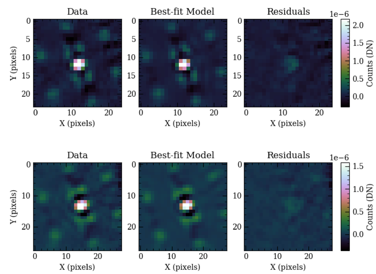 The emission from planet b in the F356W (top) and F444W (bottom) filters is well matched to a simulated PSF, both the central W-shaped profile and the hexasymmetric outlier spots. Subtracting the PSF model (center) from the data (left) leaves clean residuals (right). The photometry and astrometry for this best-fit model are given in Table 4.