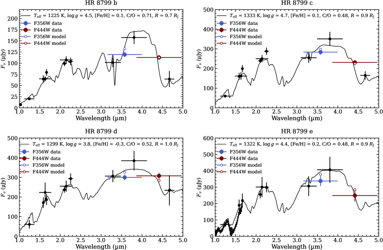 Newly acquired JWST photometry in the F356W and F444W filters (blue and red circles) is combined with photometry and spectroscopy of the four planets (black points) and fit with EXO-REM atmospheric models (black lines). Horizontal bars show the width in each photometric filter. The open blue and red circles show the flux expected from each model after convolving with the wide JWST bandpasses. While the JWST photometry is consistent with previous observations, the measured F356W fluxes tend to be lower than expectation from the L band measurements.