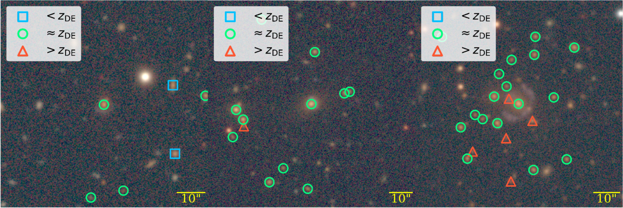 Example zphot measurements of the LOS for (from left) galaxy- (AGEL0003), group- (AGEL0919), and cluster-scale environment candidates. Foreground candidates (<0.8 × zdefl) are shown with blue squares, background candidates (>1.2 × zdefl) are shown with red triangles, and deflector environment candidates are shown with green circles. zphot and r-mag LOS distributions for all 89 systems are available at the Harvard Dataverse: doi: 10.7910/DVN/GYDQQP.