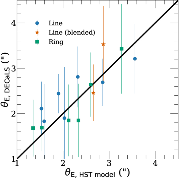Our θE measurements compared to 4 HST photometry mass-modeled lenses in N. Sahu et al. (2024) and 11 in L. Iwamoto et al. (2026, in preparation; obtained via private correspondence). We find ﹩\frac{{\rm{\Delta }}{\theta }_{\rm{E}\,}}{{\theta }_{\,\rm{E}}}=0.15,0.11,0.15﹩, for the line (blue circles), circle (green squares), and blended line (orange stars) models, respectively. The error bars correspond to half the primary image arc width measured from DECaLS imaging. We incorporate this scatter into uncertainty for the rest of our θE measurements.