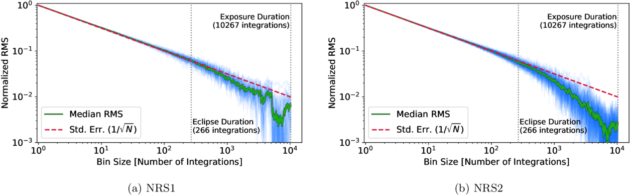 Correlated noise diagnostics for the spectroscopic channel residuals in NRS1 and NRS2. The green curves show the fitted rms of binned residuals, blue curves represent rms values for each spectroscopic channel, while the red line denotes the Gaussian standard error expectation (rms ∝ N−1/2). Both channels track the Gaussian expectation over the bin sizes, even though modest departures appear for NRS1 in several spectroscopic channels nearing the end of the exposure. Dashed vertical lines designating the number of integrations within an eclipse and exposure durations (1 exposure was used for the entire phase curve observation) are shown for reference—demonstrating well-controlled time-correlated noise for the science intervals of interest.