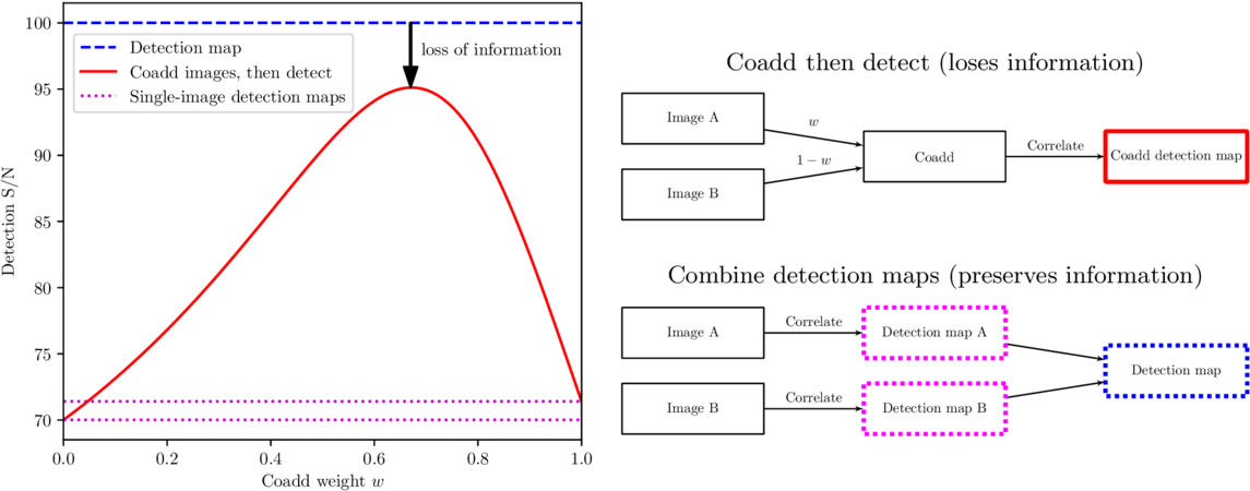 The benefit of constructing a detection map vs. coadding the images and then detecting sources on the coadd. Here we have two images with PSF widths different by a factor of two, and exposure times such that the depths are similar. The signal-to-noise ratio at which a source is detected in the individual images is shown by the dotted lines at the bottom. By constructing a detection map, we extract all the available signal in the combination of the two images; the detection map signal-to-noise ratio (dashed line at top) equals the sum-in-quadrature of the two images. However, if we instead coadd the images and then detect the source in the coadd (solid curve), we lose a significant fraction of the signal-to-noise ratio, regardless of the weighting factor applied to the two images. That is, the solid line never reaches the dashed line; creating a coadd and then detecting on it always loses signal-to-noise ratio when the PSFs are not identical.