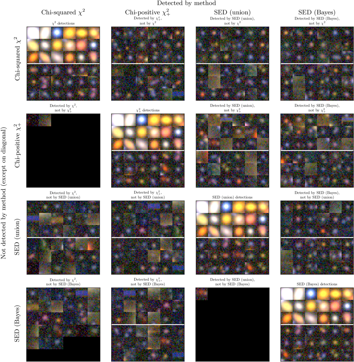 Sources detected by the different methods. On the diagonal are shown grids of sources detected by each method, including the first (brightest) and last (faintest) 18 sources. Notice that the brightest sources detected by the different methods are almost identical. The off-diagonal images show the brightest and faintest sources that are detected by one method and not another. Two methods can be compared qualitatively by examining the two plots that appear across the diagonal from each other. For the images below the diagonal, a significant number of the additional detections are not true isolated sources but perhaps arise from small deviations in the outer light profiles of galaxies. Note: although the detection was performed on single images, the color images here are from 100-image deep coadds, in order to show the “truth.” In general, the SED-matched methods produce more real source detections than the chi-squared methods.