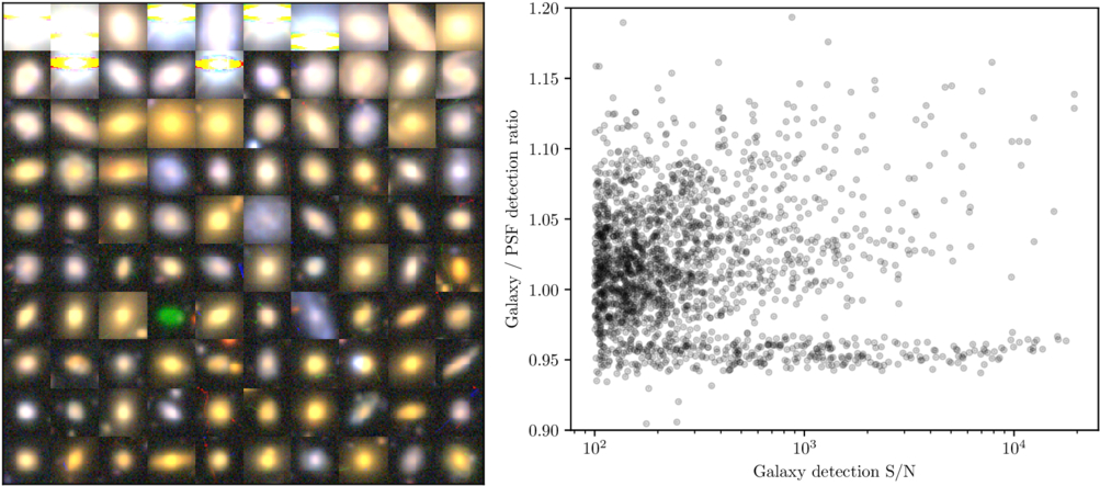 Galaxy detection. Left: detections from an extended-source detector, sorted by the difference in detection strength between the “yellow galaxy” and “yellow point-source” detectors. The bright stars are likely included because their saturated cores cause difficulty in correctly measuring the signal-to-noise ratio. The remaining sources are all galaxies, except for one fast-moving asteroid that is spatially extended. Right: relative strength of detection of sources in the extended vs. PSF detection filters. The extended-source filter used here is a 1″ FWHM round Gaussian. There is a clear line of sources with a detection ratio around 0.95, corresponding to point sources. Sources with ratios above unity are closer in profile to the target profile than to a point source, with the largest ratios probably corresponding to sources that are approximately equal to the target profile.