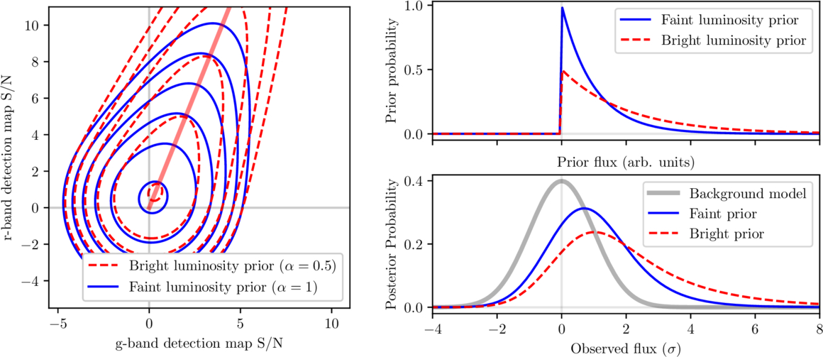 The effect of the flux prior in Bayesian SED-matched source detection. In order to produce closed-form integrals, we use an exponential prior on the flux; here we show the effect of the exponential scale factor (α) on the results. Left: probability contours for the “Red” foreground model, as before, with α = 1, compared with a flux prior that prefers brighter sources—larger observed fluxes are considered more probable—with α = 0.5. Right: a one-dimensional example showing the effect of changing the flux prior by a factor of two. The dashed model places more prior belief in larger fluxes and therefore must produce smaller probabilities at low flux levels. This illustrates that care must be taken with the scale factor of the flux prior.