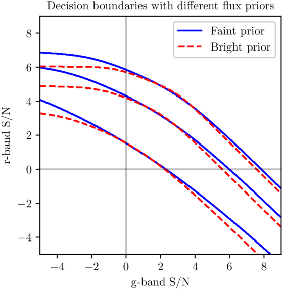 The effect of the flux prior on the decision boundaries of Bayesian SED-matched source detection. The exponential scale factor α affects the shape of the decision contours. Decision contours for three different false-positive rates are shown (10−1, 10−4, and 10−7) for two different “alpha” values (“bright”: α = 1; “faint”: α = 4). The foreground model is the three-SED model used in previous figures. The detailed shape of the decision boundary is affected by the flux prior.