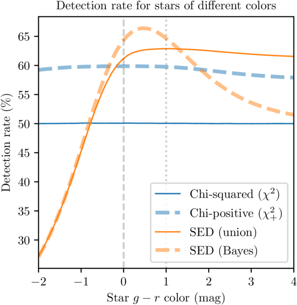 Detection rates for the χ2-based and SED-matched detection methods, as a function of the color of the star. For each color, we set the true fluxes in the g and r bands so that their quadrature-summed signal-to-noise ratio is constant (with the constant chosen so that the χ2 method produced roughly 50% detection rate), and then added independent Gaussian noise with equal variance in the two bands. The threshold for each method was set so that their false-positive rates were equal. Since the χ2 method does not care about the color of the star, its performance is constant. The ﹩{\chi }_{+}^{2}﹩ method has a slight sensitivity to the color of the star: at the color extremes where the flux is concentrated in one band, noise can scatter the star to have negative flux, which makes the ﹩{\chi }_{+}^{2}﹩ method less likely to detect it. But the largest effect is due to the ﹩{\chi }_{+}^{2}﹩ method having a lower detection threshold because ignoring negative fluxes results in a lower false-positive rate, giving it an overall greater detection rate than the χ2 method. As expected, the SED-matched methods show a “tuning” effect where they are most efficient at detecting stars of the expected colors, which in this case are, as before, “flat” (color zero), “red” (color one), and “r-band-only”; for the Bayesian methods these are weighted 49%, 49%, and 2%, respectively. The vertical dashed lines mark these “tuned” colors. As a result, very blue stars are unexpected, and their detection efficiency drops sharply, while very red stars are expected (even if at a low rate) and show a fair detection rate. Interestingly, the Bayesian method peaks at color 0.5, because these stars are acceptable to both the “flat” and “red” SEDs.