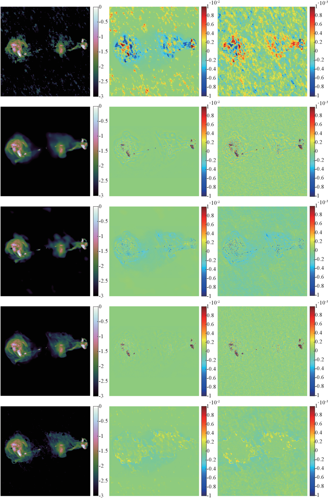 Reconstruction results of the 3c353 galaxy. From top to bottom, the rows present results of SARA, AIRI, LPG, R2D2, and GMCP, respectively. From left to right, the columns display the reconstructed images (on a log10 scale), error images (in a linear scale), and residual images (in a linear scale), separately.