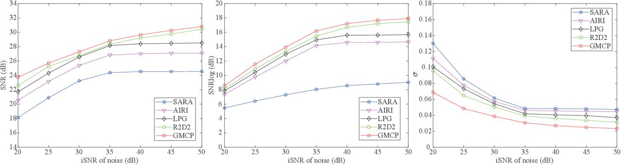 Reconstruction performance of the algorithms under different noise levels. Left: the SNR. Middle: the SNRlog. Right: the fidelity.
