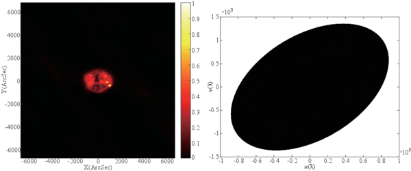 Left-hand side: the test image of the Sun in a linear scale. Right-hand: the DART baseline coverage.
