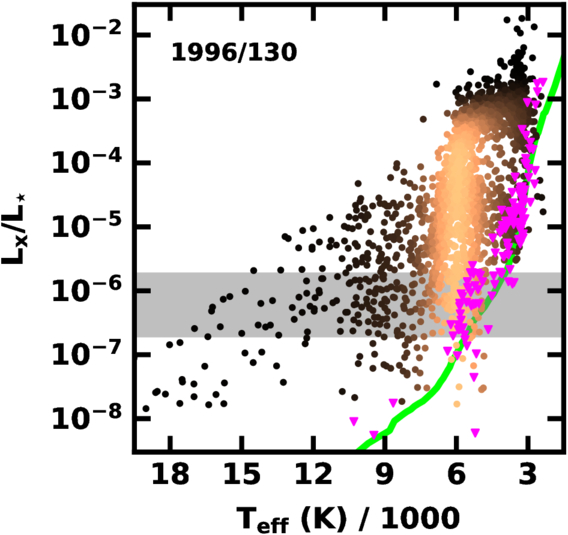 Fractional X-ray luminosity (LX/L⋆) as a function of the effective temperature for 1996 stars with measured Teff, L⋆, LX. Filled fuchsia triangles indicate upper limits for 130 stars with d ≤ 17 pc. The horizontal gray band shows the range of the fractional X-ray luminosity for the Sun (P. G. Judge et al. 2003). Adopting the M. J. Pecaut & E. E. Mamajek (2013) Teff–L⋆ relation for main-sequence stars, the green line indicates approximate SRG/eROSITA and ROSAT detection limits at distances of 10–20 pc.