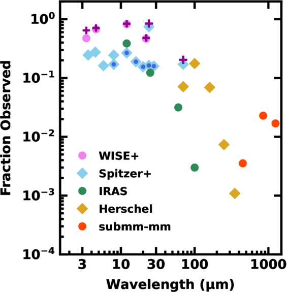 The same as in Figure 1 for data from WISE (purple), Spitzer IRAC and MIPS (light blue), IRAS (dark green), Herschel PACS and SPIRE (gold), and submillimeter to millimeter (red). The light-blue symbols with a dark-blue center indicate the fraction of CDDS stars with high-quality synthetic photometry at 8–25 μm from Spitzer IRS. The fraction of observed sources ranges from ∼1% to 2% at the longest wavelengths to ∼10%–20% for Spitzer IRAC, Spitzer IRS, and IRAS 25 μm to ≳ 50% for W3, W4, and MIPS 24 μm measurements. With a fraction observed of zero for 500 μm SPIRE data with SNR ≥ 3, this point is not shown.